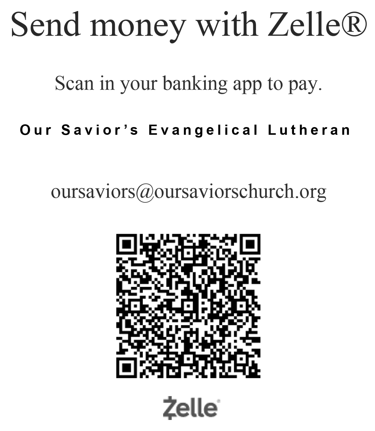 If you would like to make a quick and secure financial donation to Our Savior's Lutheran Church, you may send your gift through your Zelle app or Zelle within your Banking app or Scan the QR Code.